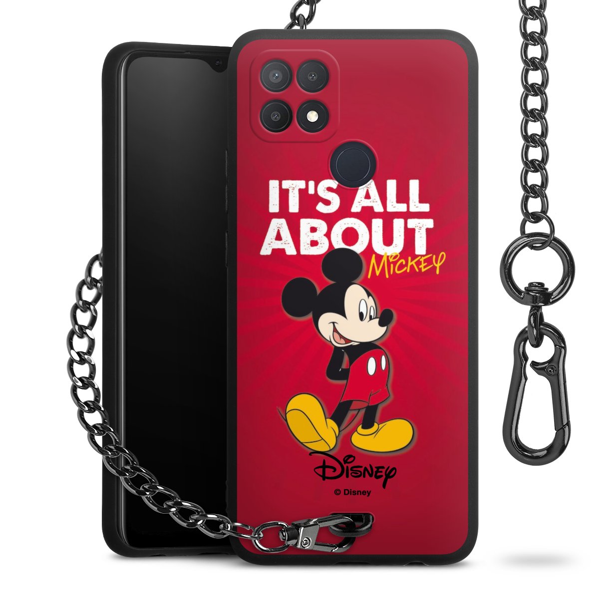Die Handyhülle verfügt über eine mittig am unteren Rand platzierte Öse, an der die Metallkette stabil befestigt ist. Bestelle die Hülle einfach für Dein Smartphone-Modell, dann passt sie wie angegossen und Du brauchst sie bloß einmal anzudrücken. Handy in die Tasche, Karabiner an den Hosenbund – schon kann die Party starten.