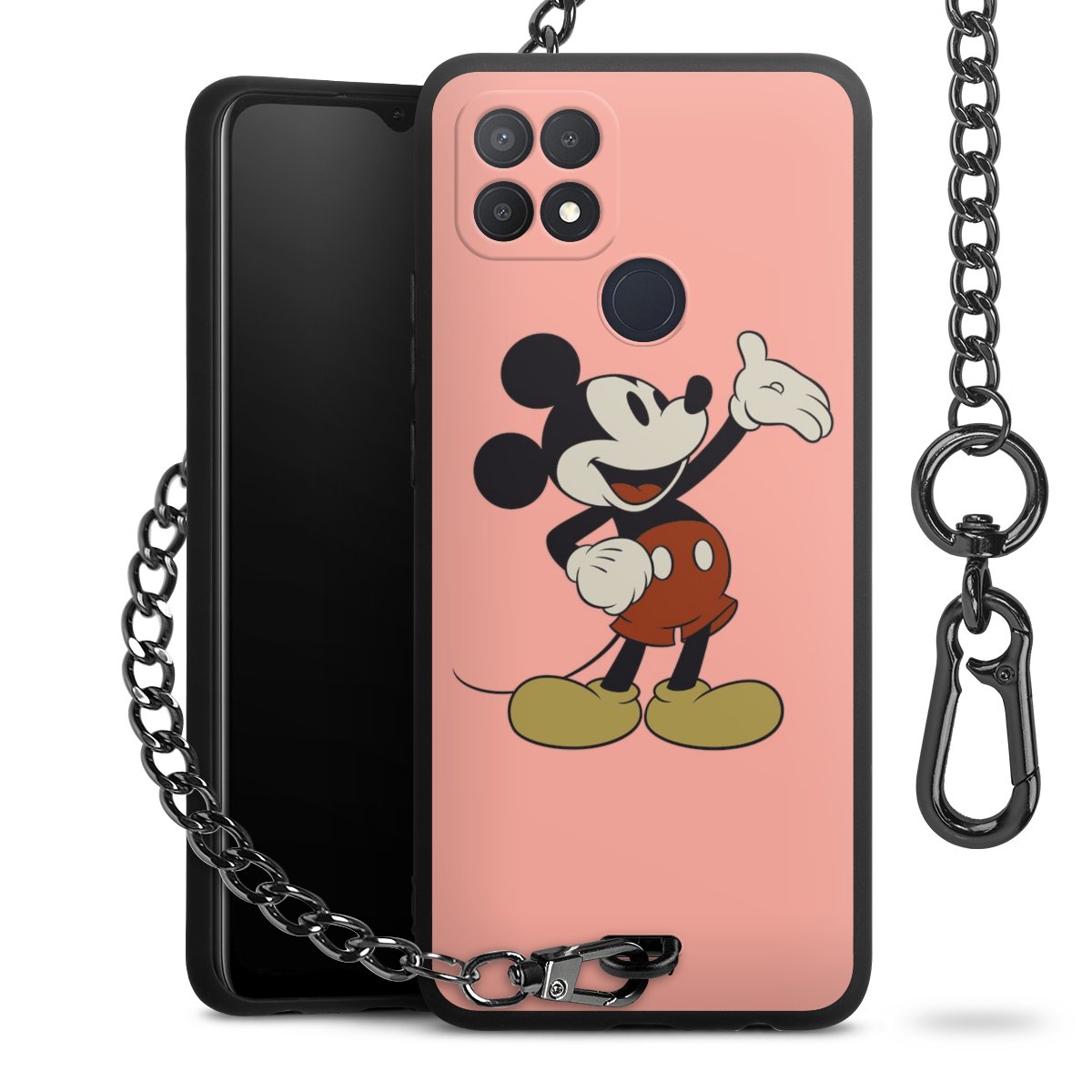 Die Handyhülle verfügt über eine mittig am unteren Rand platzierte Öse, an der die Metallkette stabil befestigt ist. Bestelle die Hülle einfach für Dein Smartphone-Modell, dann passt sie wie angegossen und Du brauchst sie bloß einmal anzudrücken. Handy in die Tasche, Karabiner an den Hosenbund – schon kann die Party starten.