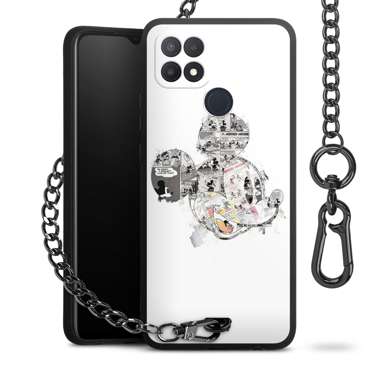 Die Handyhülle verfügt über eine mittig am unteren Rand platzierte Öse, an der die Metallkette stabil befestigt ist. Bestelle die Hülle einfach für Dein Smartphone-Modell, dann passt sie wie angegossen und Du brauchst sie bloß einmal anzudrücken. Handy in die Tasche, Karabiner an den Hosenbund – schon kann die Party starten.