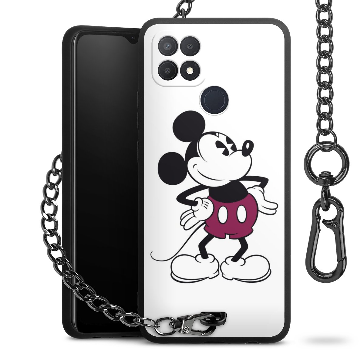 Die Handyhülle verfügt über eine mittig am unteren Rand platzierte Öse, an der die Metallkette stabil befestigt ist. Bestelle die Hülle einfach für Dein Smartphone-Modell, dann passt sie wie angegossen und Du brauchst sie bloß einmal anzudrücken. Handy in die Tasche, Karabiner an den Hosenbund – schon kann die Party starten.