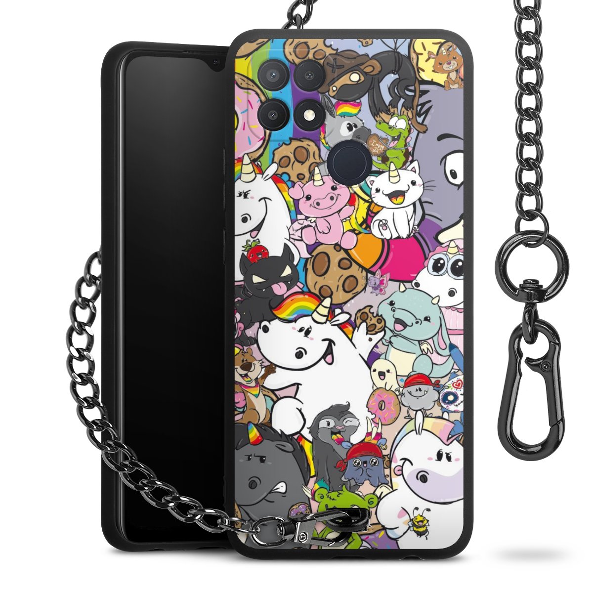 Die Handyhülle verfügt über eine mittig am unteren Rand platzierte Öse, an der die Metallkette stabil befestigt ist. Bestelle die Hülle einfach für Dein Smartphone-Modell, dann passt sie wie angegossen und Du brauchst sie bloß einmal anzudrücken. Handy in die Tasche, Karabiner an den Hosenbund – schon kann die Party starten.