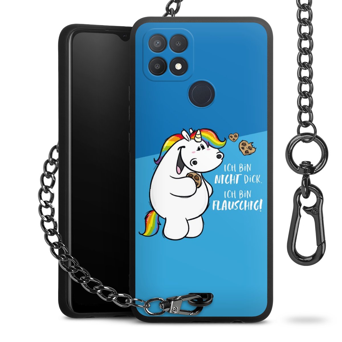Die Handyhülle verfügt über eine mittig am unteren Rand platzierte Öse, an der die Metallkette stabil befestigt ist. Bestelle die Hülle einfach für Dein Smartphone-Modell, dann passt sie wie angegossen und Du brauchst sie bloß einmal anzudrücken. Handy in die Tasche, Karabiner an den Hosenbund – schon kann die Party starten.