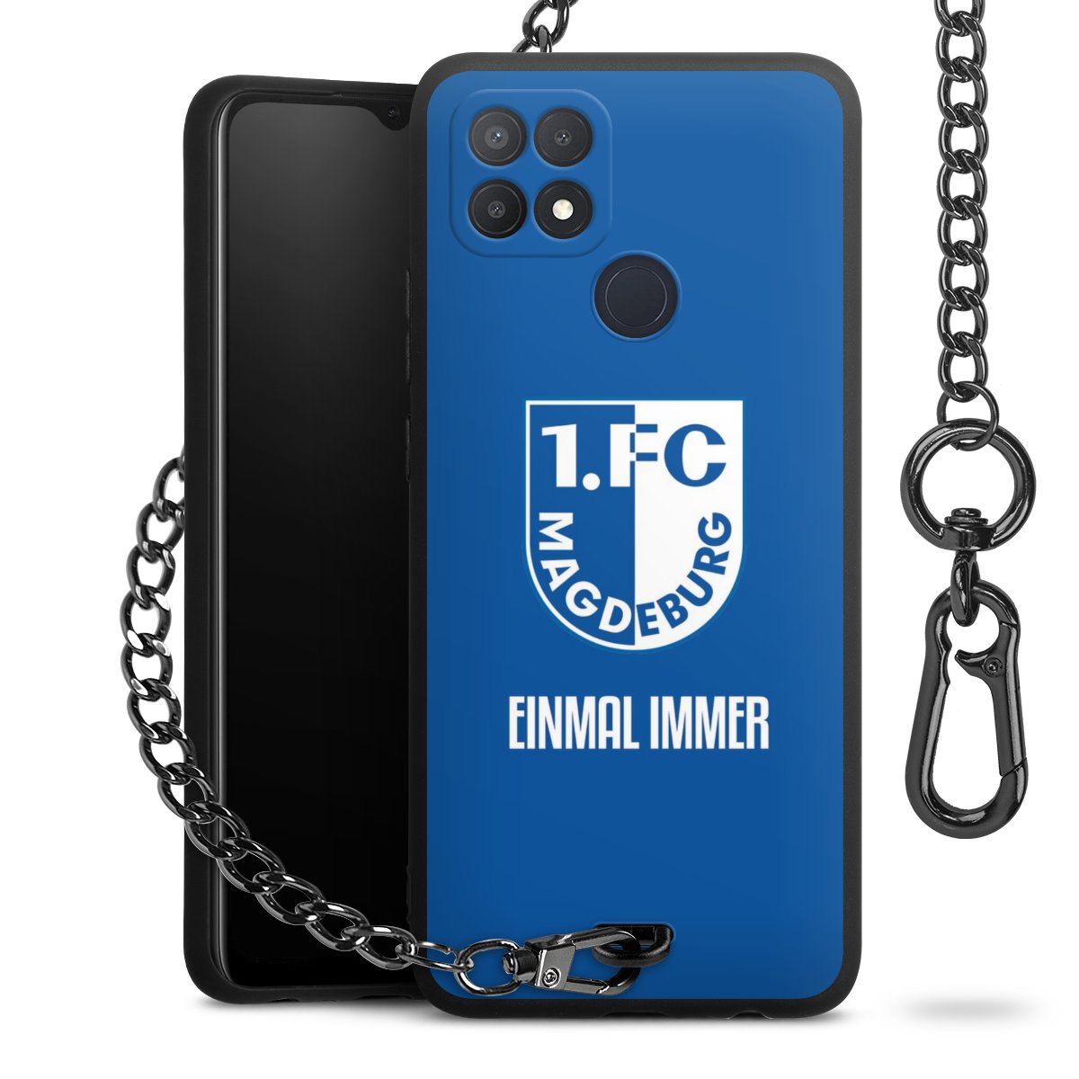 Die Handyhülle verfügt über eine mittig am unteren Rand platzierte Öse, an der die Metallkette stabil befestigt ist. Bestelle die Hülle einfach für Dein Smartphone-Modell, dann passt sie wie angegossen und Du brauchst sie bloß einmal anzudrücken. Handy in die Tasche, Karabiner an den Hosenbund – schon kann die Party starten.