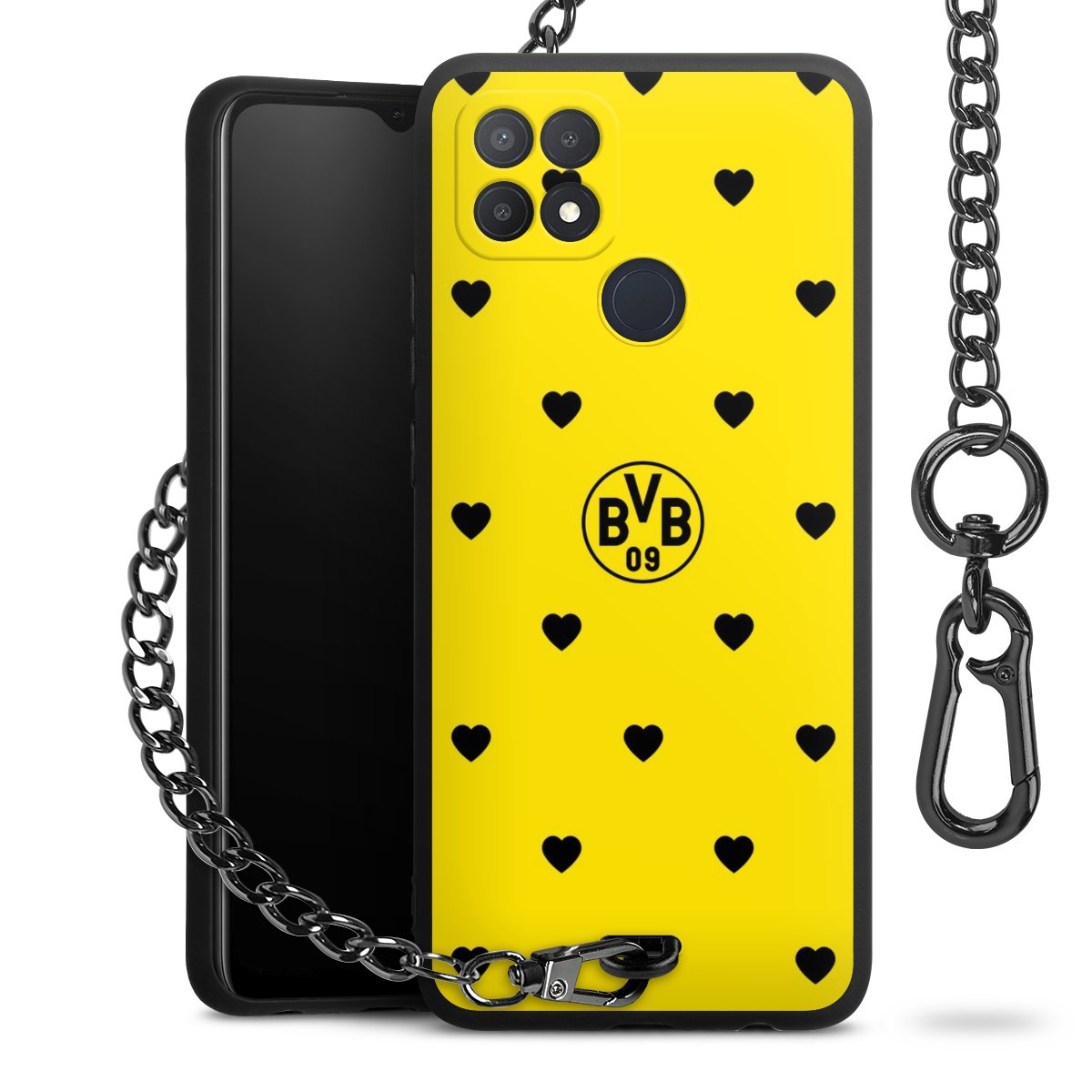 Die mattschwarze Silikon-Handyhülle besteht aus robustem TPU (thermoplastisches Polyurethan). Sie ist flexibel und schützt Dein Smartphone vor Stößen und Kratzern. Die Kette sowie der Karabinerhaken sind aus Metall in Gunmetal-Optik gefertigt. Für dieses Produkt kommen ausschließlich TÜV-geprüfte Materialien zum Einsatz.