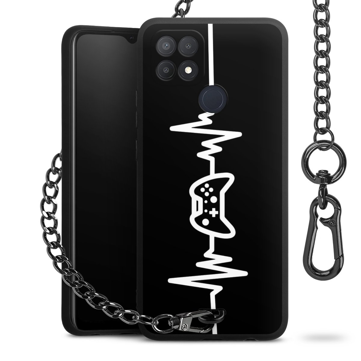Die mattschwarze Silikon-Handyhülle besteht aus robustem TPU (thermoplastisches Polyurethan). Sie ist flexibel und schützt Dein Smartphone vor Stößen und Kratzern. Die Kette sowie der Karabinerhaken sind aus Metall in Gunmetal-Optik gefertigt. Für dieses Produkt kommen ausschließlich TÜV-geprüfte Materialien zum Einsatz.