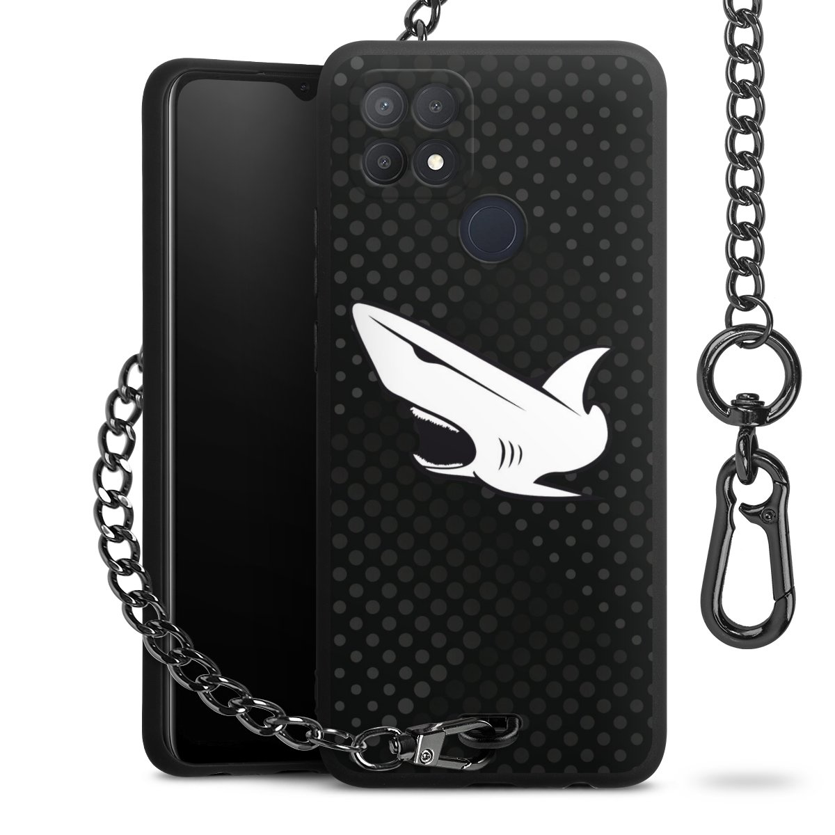 Die mattschwarze Silikon-Handyhülle besteht aus robustem TPU (thermoplastisches Polyurethan). Sie ist flexibel und schützt Dein Smartphone vor Stößen und Kratzern. Die Kette sowie der Karabinerhaken sind aus Metall in Gunmetal-Optik gefertigt. Für dieses Produkt kommen ausschließlich TÜV-geprüfte Materialien zum Einsatz.