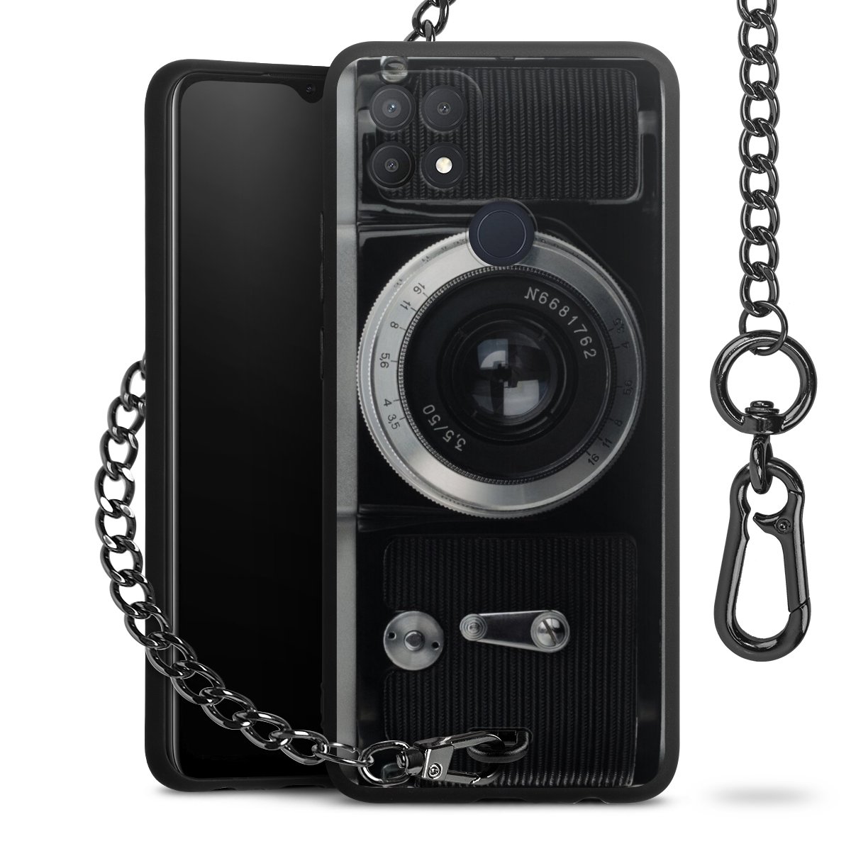 Die mattschwarze Silikon-Handyhülle besteht aus robustem TPU (thermoplastisches Polyurethan). Sie ist flexibel und schützt Dein Smartphone vor Stößen und Kratzern. Die Kette sowie der Karabinerhaken sind aus Metall in Gunmetal-Optik gefertigt. Für dieses Produkt kommen ausschließlich TÜV-geprüfte Materialien zum Einsatz.