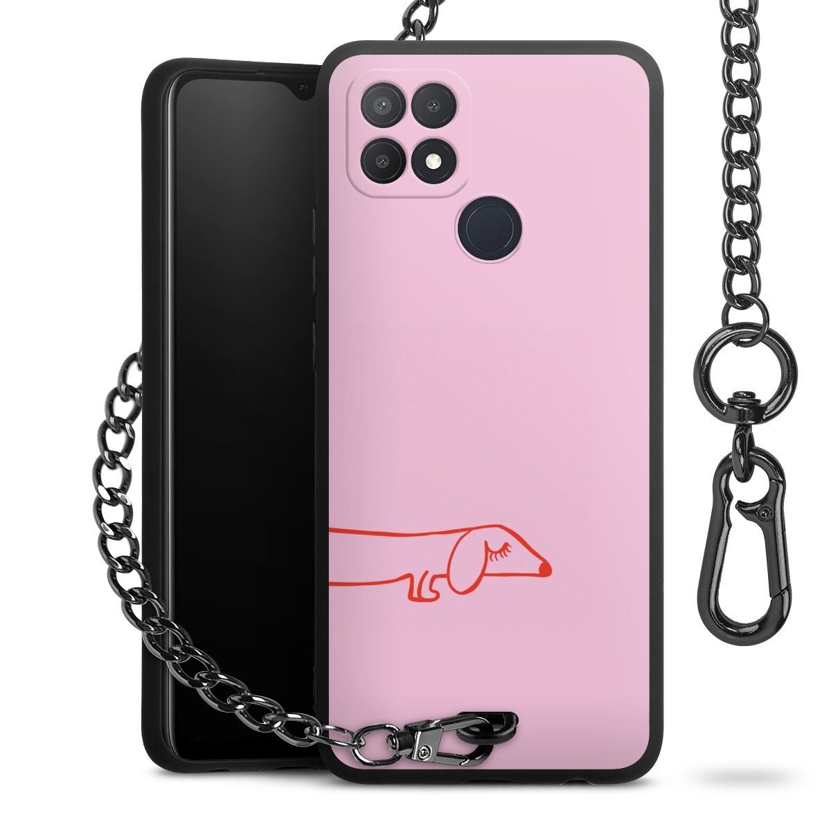 Die Handyhülle verfügt über eine mittig am unteren Rand platzierte Öse, an der die Metallkette stabil befestigt ist. Bestelle die Hülle einfach für Dein Smartphone-Modell, dann passt sie wie angegossen und Du brauchst sie bloß einmal anzudrücken. Handy in die Tasche, Karabiner an den Hosenbund – schon kann die Party starten.