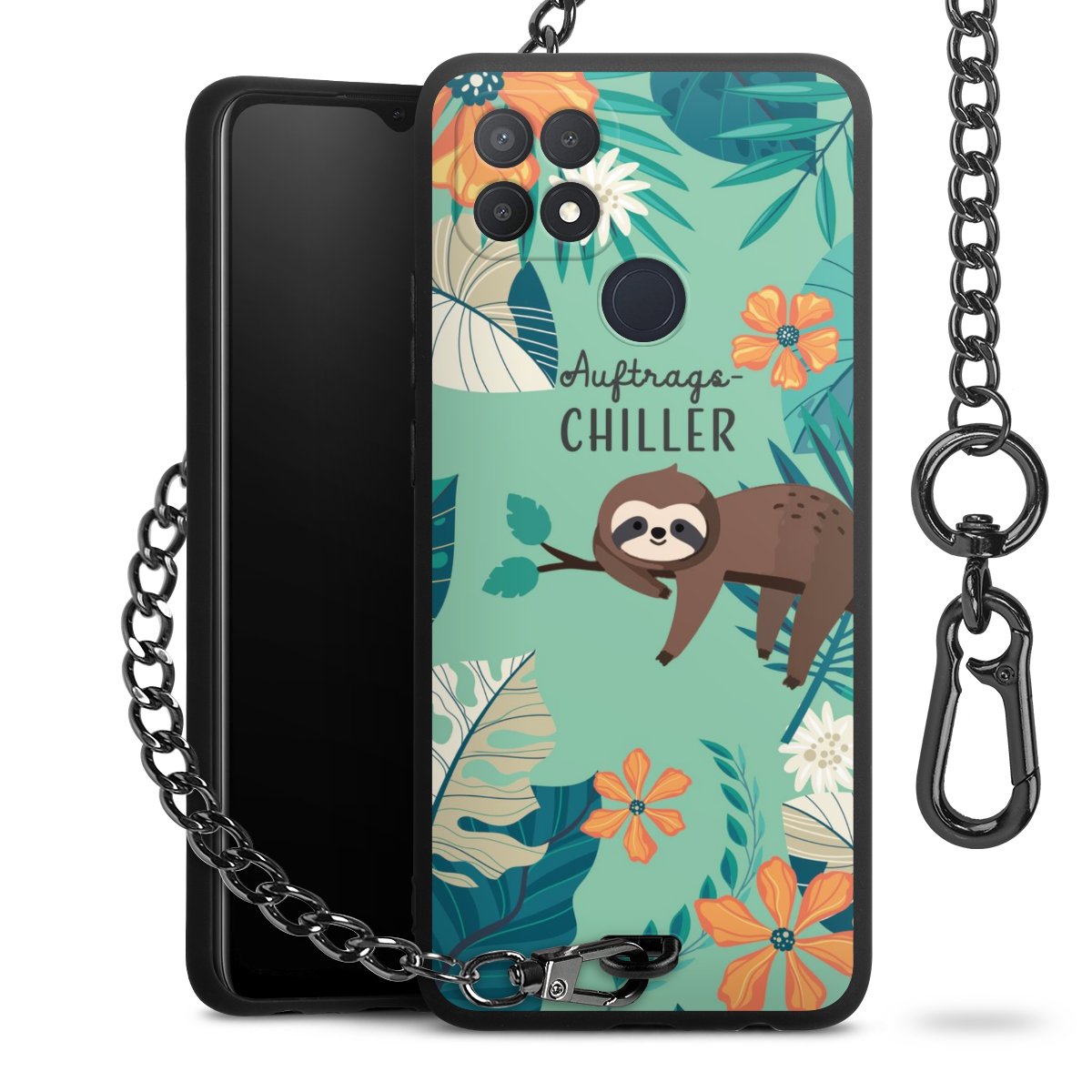 Die mattschwarze Silikon-Handyhülle besteht aus robustem TPU (thermoplastisches Polyurethan). Sie ist flexibel und schützt Dein Smartphone vor Stößen und Kratzern. Die Kette sowie der Karabinerhaken sind aus Metall in Gunmetal-Optik gefertigt. Für dieses Produkt kommen ausschließlich TÜV-geprüfte Materialien zum Einsatz.