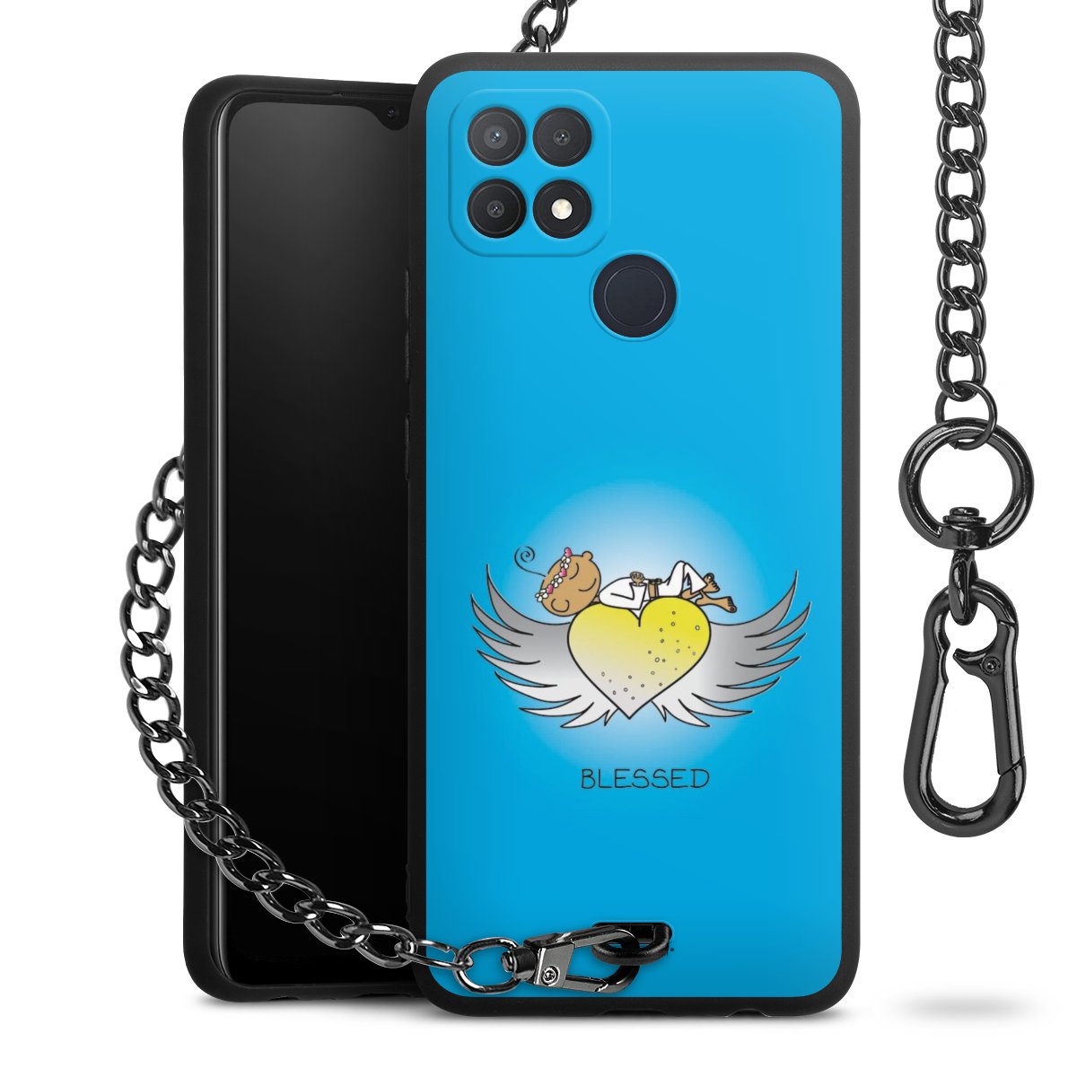 Die mattschwarze Silikon-Handyhülle besteht aus robustem TPU (thermoplastisches Polyurethan). Sie ist flexibel und schützt Dein Smartphone vor Stößen und Kratzern. Die Kette sowie der Karabinerhaken sind aus Metall in Gunmetal-Optik gefertigt. Für dieses Produkt kommen ausschließlich TÜV-geprüfte Materialien zum Einsatz.