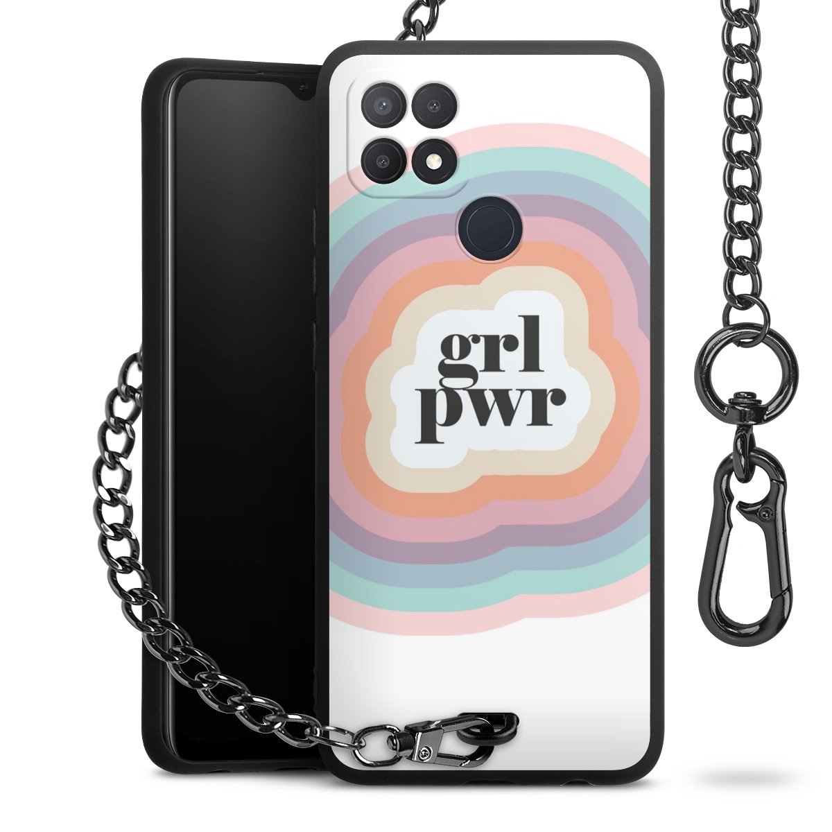 Die mattschwarze Silikon-Handyhülle besteht aus robustem TPU (thermoplastisches Polyurethan). Sie ist flexibel und schützt Dein Smartphone vor Stößen und Kratzern. Die Kette sowie der Karabinerhaken sind aus Metall in Gunmetal-Optik gefertigt. Für dieses Produkt kommen ausschließlich TÜV-geprüfte Materialien zum Einsatz.