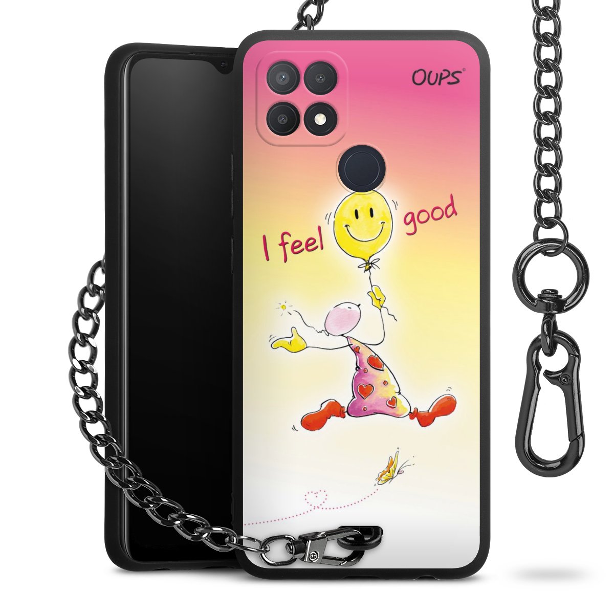 Die Handyhülle verfügt über eine mittig am unteren Rand platzierte Öse, an der die Metallkette stabil befestigt ist. Bestelle die Hülle einfach für Dein Smartphone-Modell, dann passt sie wie angegossen und Du brauchst sie bloß einmal anzudrücken. Handy in die Tasche, Karabiner an den Hosenbund – schon kann die Party starten.