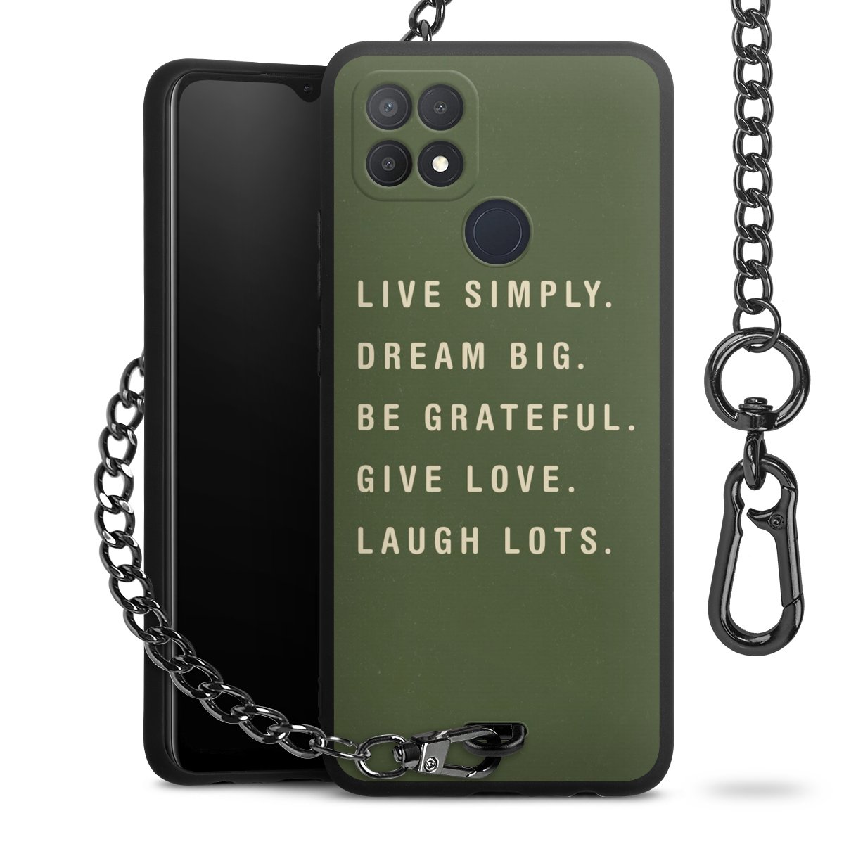 Die mattschwarze Silikon-Handyhülle besteht aus robustem TPU (thermoplastisches Polyurethan). Sie ist flexibel und schützt Dein Smartphone vor Stößen und Kratzern. Die Kette sowie der Karabinerhaken sind aus Metall in Gunmetal-Optik gefertigt. Für dieses Produkt kommen ausschließlich TÜV-geprüfte Materialien zum Einsatz.
