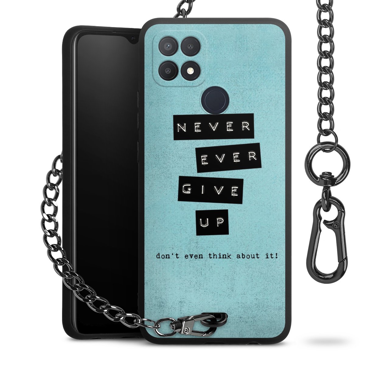 Die Handyhülle verfügt über eine mittig am unteren Rand platzierte Öse, an der die Metallkette stabil befestigt ist. Bestelle die Hülle einfach für Dein Smartphone-Modell, dann passt sie wie angegossen und Du brauchst sie bloß einmal anzudrücken. Handy in die Tasche, Karabiner an den Hosenbund – schon kann die Party starten.