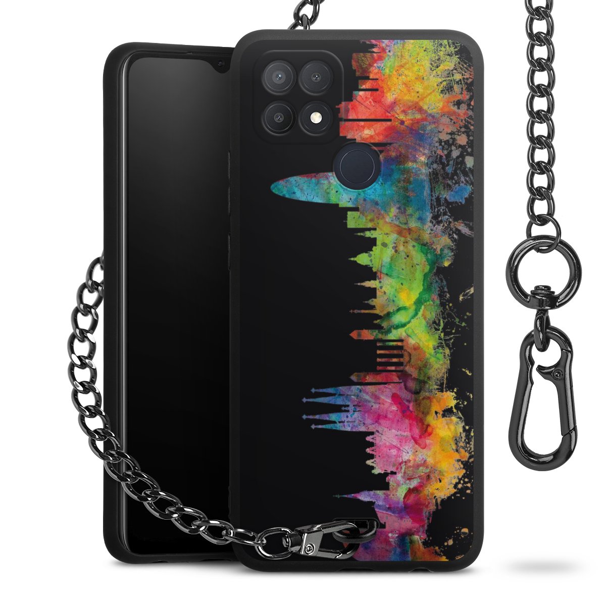 Die Handyhülle verfügt über eine mittig am unteren Rand platzierte Öse, an der die Metallkette stabil befestigt ist. Bestelle die Hülle einfach für Dein Smartphone-Modell, dann passt sie wie angegossen und Du brauchst sie bloß einmal anzudrücken. Handy in die Tasche, Karabiner an den Hosenbund – schon kann die Party starten.