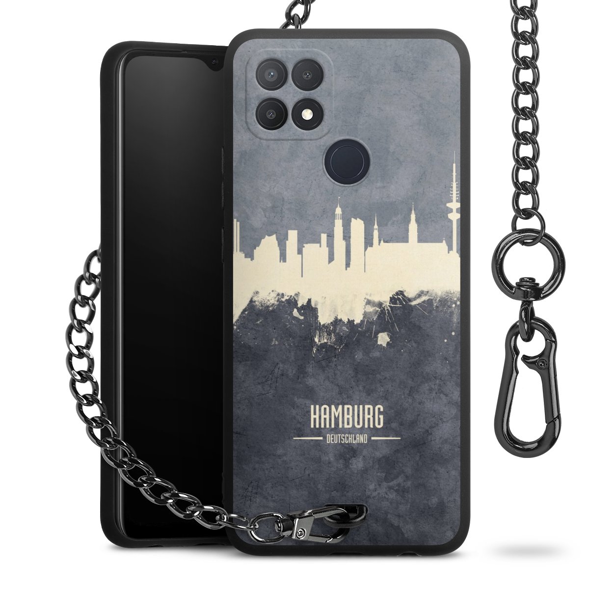 Die mattschwarze Silikon-Handyhülle besteht aus robustem TPU (thermoplastisches Polyurethan). Sie ist flexibel und schützt Dein Smartphone vor Stößen und Kratzern. Die Kette sowie der Karabinerhaken sind aus Metall in Gunmetal-Optik gefertigt. Für dieses Produkt kommen ausschließlich TÜV-geprüfte Materialien zum Einsatz.