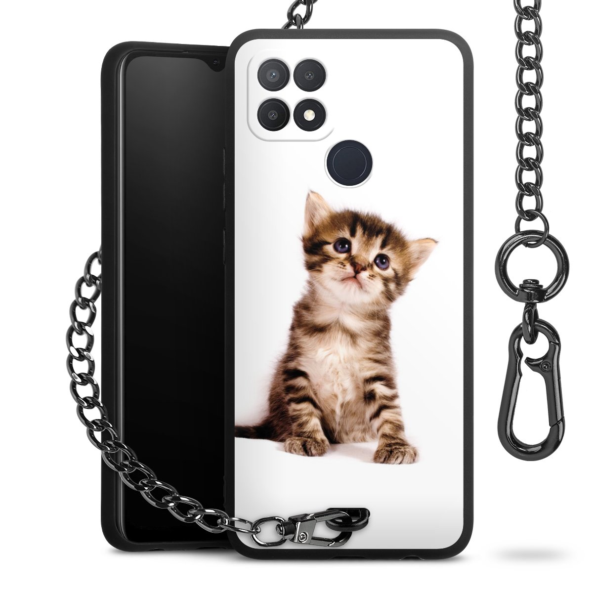 Die Handyhülle verfügt über eine mittig am unteren Rand platzierte Öse, an der die Metallkette stabil befestigt ist. Bestelle die Hülle einfach für Dein Smartphone-Modell, dann passt sie wie angegossen und Du brauchst sie bloß einmal anzudrücken. Handy in die Tasche, Karabiner an den Hosenbund – schon kann die Party starten.