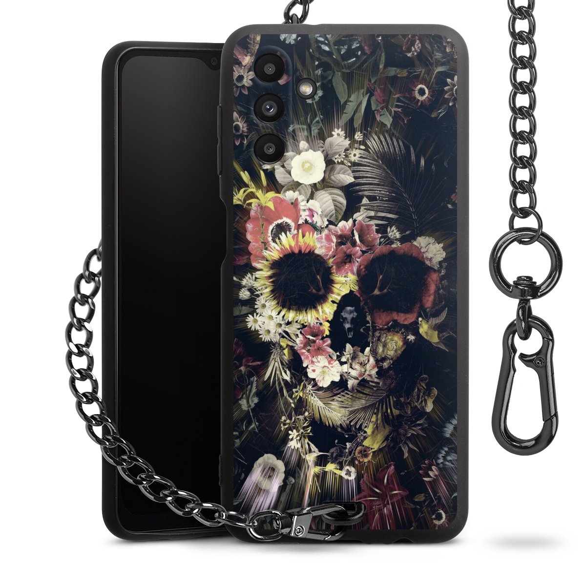 Die mattschwarze Silikon-Handyhülle besteht aus robustem TPU (thermoplastisches Polyurethan). Sie ist flexibel und schützt Dein Smartphone vor Stößen und Kratzern. Die Kette sowie der Karabinerhaken sind aus Metall in Gunmetal-Optik gefertigt. Für dieses Produkt kommen ausschließlich TÜV-geprüfte Materialien zum Einsatz.