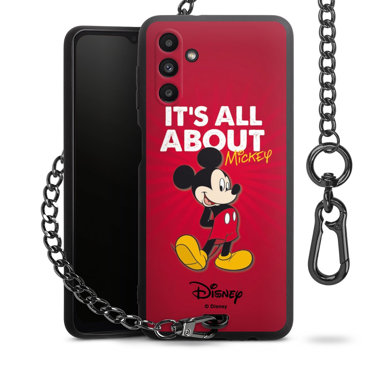 Die Handyhülle verfügt über eine mittig am unteren Rand platzierte Öse, an der die Metallkette stabil befestigt ist. Bestelle die Hülle einfach für Dein Smartphone-Modell, dann passt sie wie angegossen und Du brauchst sie bloß einmal anzudrücken. Handy in die Tasche, Karabiner an den Hosenbund – schon kann die Party starten.