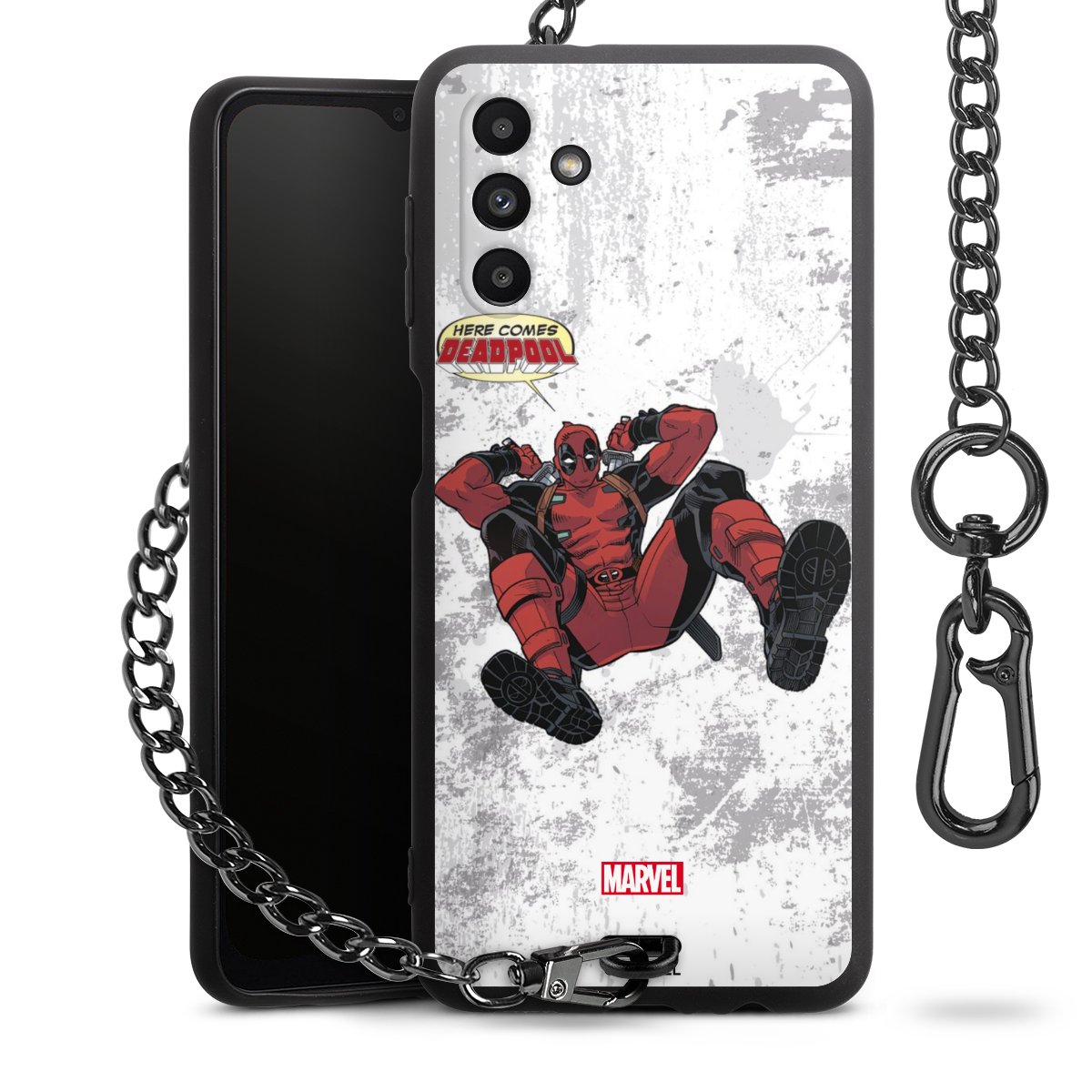 Die mattschwarze Silikon-Handyhülle besteht aus robustem TPU (thermoplastisches Polyurethan). Sie ist flexibel und schützt Dein Smartphone vor Stößen und Kratzern. Die Kette sowie der Karabinerhaken sind aus Metall in Gunmetal-Optik gefertigt. Für dieses Produkt kommen ausschließlich TÜV-geprüfte Materialien zum Einsatz.