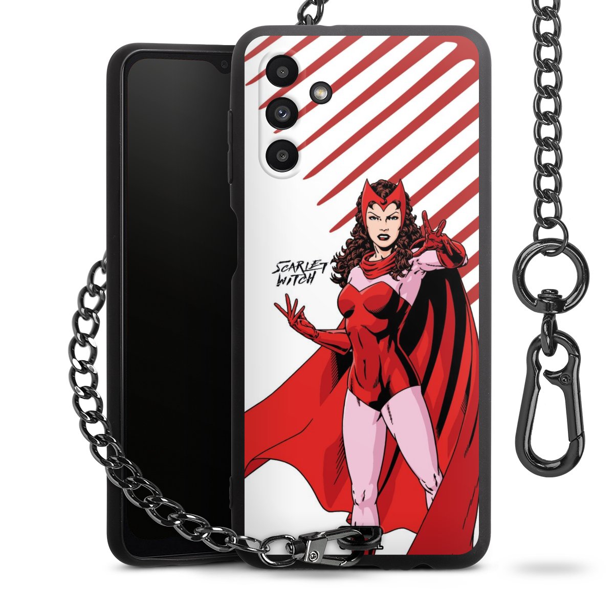 Die Handyhülle verfügt über eine mittig am unteren Rand platzierte Öse, an der die Metallkette stabil befestigt ist. Bestelle die Hülle einfach für Dein Smartphone-Modell, dann passt sie wie angegossen und Du brauchst sie bloß einmal anzudrücken. Handy in die Tasche, Karabiner an den Hosenbund – schon kann die Party starten.
