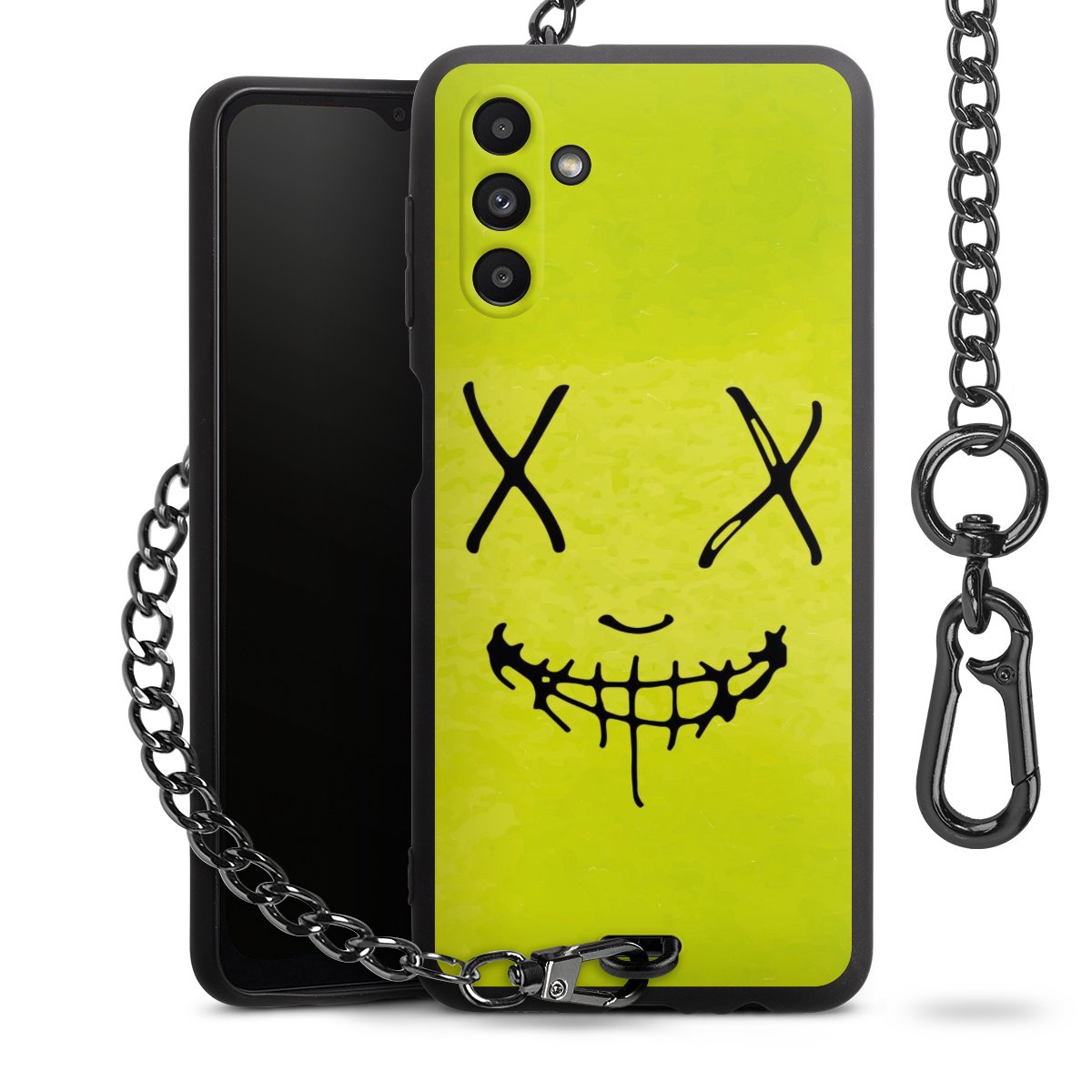 Die mattschwarze Silikon-Handyhülle besteht aus robustem TPU (thermoplastisches Polyurethan). Sie ist flexibel und schützt Dein Smartphone vor Stößen und Kratzern. Die Kette sowie der Karabinerhaken sind aus Metall in Gunmetal-Optik gefertigt. Für dieses Produkt kommen ausschließlich TÜV-geprüfte Materialien zum Einsatz.