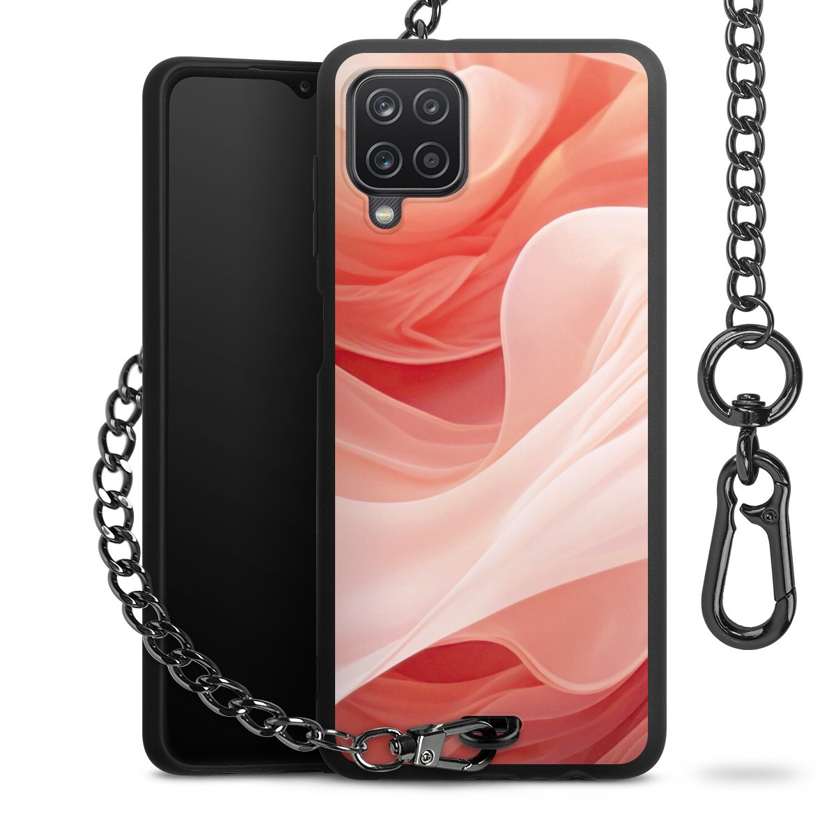 Die mattschwarze Silikon-Handyhülle besteht aus robustem TPU (thermoplastisches Polyurethan). Sie ist flexibel und schützt Dein Smartphone vor Stößen und Kratzern. Die Kette sowie der Karabinerhaken sind aus Metall in Gunmetal-Optik gefertigt. Für dieses Produkt kommen ausschließlich TÜV-geprüfte Materialien zum Einsatz.