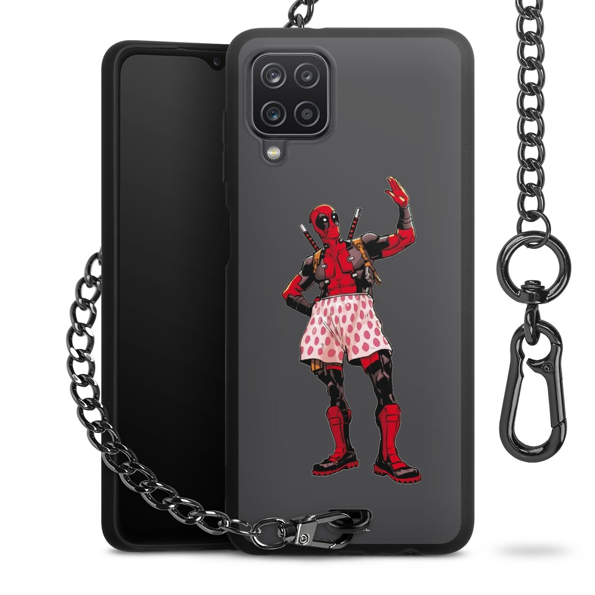 Die mattschwarze Silikon-Handyhülle besteht aus robustem TPU (thermoplastisches Polyurethan). Sie ist flexibel und schützt Dein Smartphone vor Stößen und Kratzern. Die Kette sowie der Karabinerhaken sind aus Metall in Gunmetal-Optik gefertigt. Für dieses Produkt kommen ausschließlich TÜV-geprüfte Materialien zum Einsatz.
