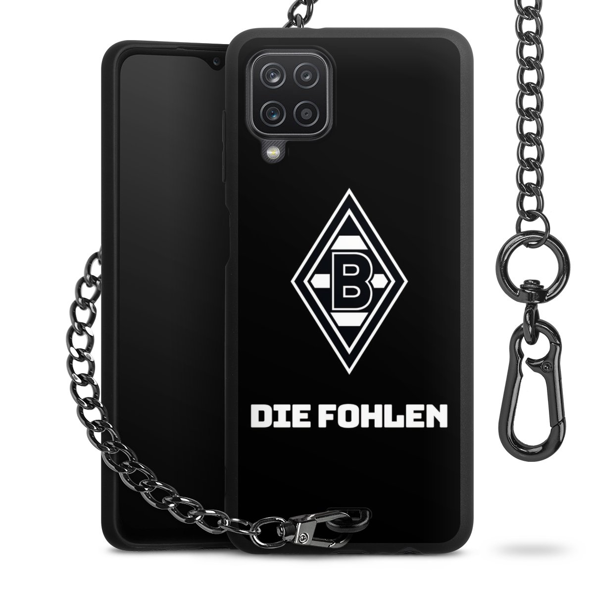 Die mattschwarze Silikon-Handyhülle besteht aus robustem TPU (thermoplastisches Polyurethan). Sie ist flexibel und schützt Dein Smartphone vor Stößen und Kratzern. Die Kette sowie der Karabinerhaken sind aus Metall in Gunmetal-Optik gefertigt. Für dieses Produkt kommen ausschließlich TÜV-geprüfte Materialien zum Einsatz.