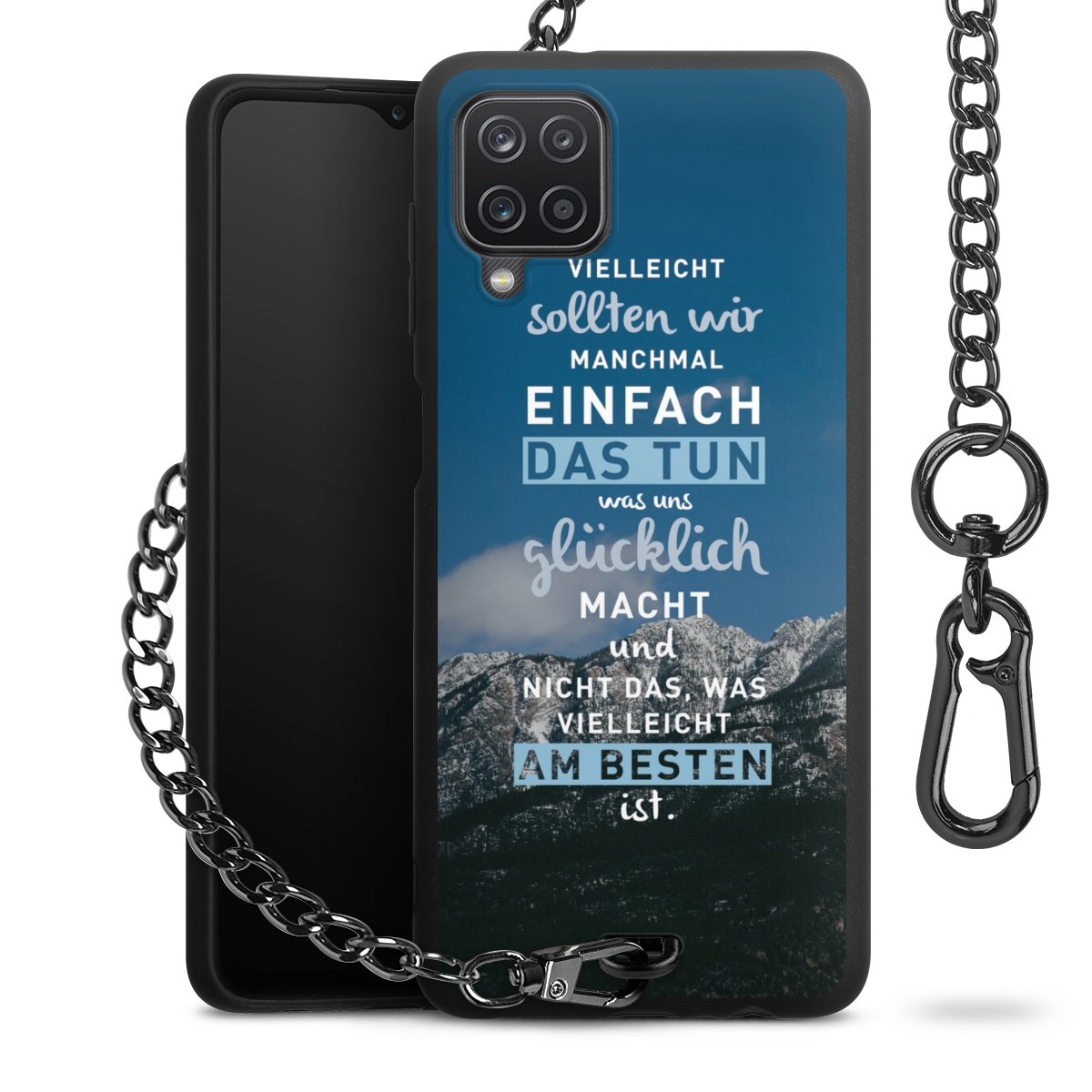 Die mattschwarze Silikon-Handyhülle besteht aus robustem TPU (thermoplastisches Polyurethan). Sie ist flexibel und schützt Dein Smartphone vor Stößen und Kratzern. Die Kette sowie der Karabinerhaken sind aus Metall in Gunmetal-Optik gefertigt. Für dieses Produkt kommen ausschließlich TÜV-geprüfte Materialien zum Einsatz.