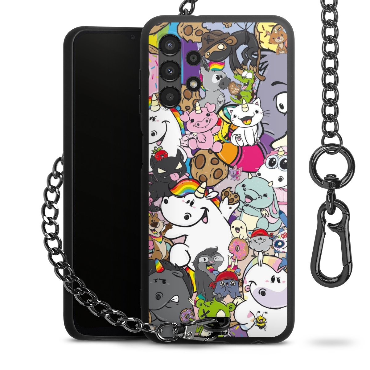 Die Handyhülle verfügt über eine mittig am unteren Rand platzierte Öse, an der die Metallkette stabil befestigt ist. Bestelle die Hülle einfach für Dein Smartphone-Modell, dann passt sie wie angegossen und Du brauchst sie bloß einmal anzudrücken. Handy in die Tasche, Karabiner an den Hosenbund – schon kann die Party starten.