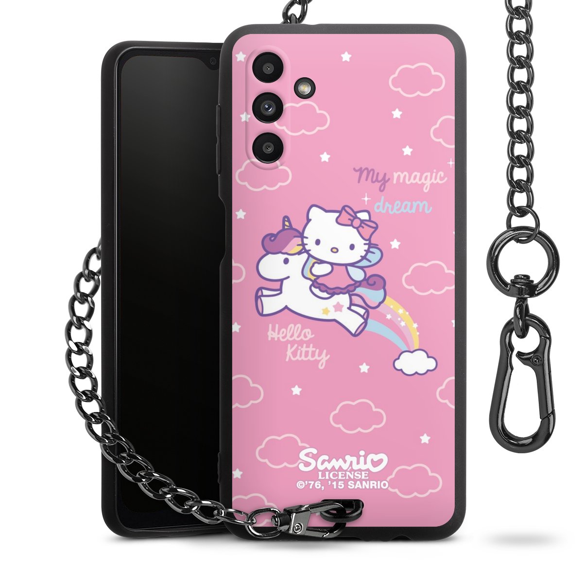 Die Handyhülle verfügt über eine mittig am unteren Rand platzierte Öse, an der die Metallkette stabil befestigt ist. Bestelle die Hülle einfach für Dein Smartphone-Modell, dann passt sie wie angegossen und Du brauchst sie bloß einmal anzudrücken. Handy in die Tasche, Karabiner an den Hosenbund – schon kann die Party starten.