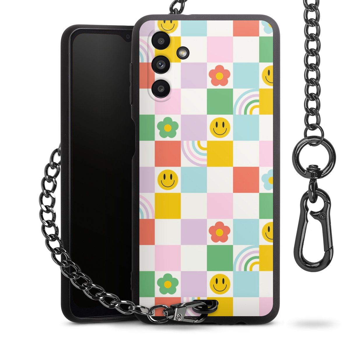 Die mattschwarze Silikon-Handyhülle besteht aus robustem TPU (thermoplastisches Polyurethan). Sie ist flexibel und schützt Dein Smartphone vor Stößen und Kratzern. Die Kette sowie der Karabinerhaken sind aus Metall in Gunmetal-Optik gefertigt. Für dieses Produkt kommen ausschließlich TÜV-geprüfte Materialien zum Einsatz.