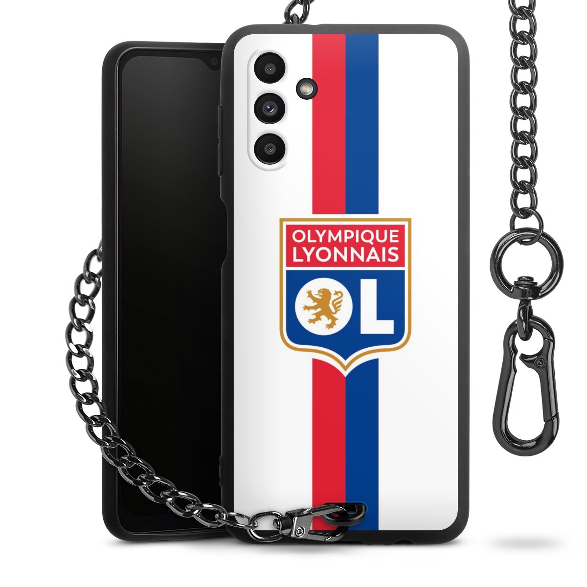 Die Handyhülle verfügt über eine mittig am unteren Rand platzierte Öse, an der die Metallkette stabil befestigt ist. Bestelle die Hülle einfach für Dein Smartphone-Modell, dann passt sie wie angegossen und Du brauchst sie bloß einmal anzudrücken. Handy in die Tasche, Karabiner an den Hosenbund – schon kann die Party starten.