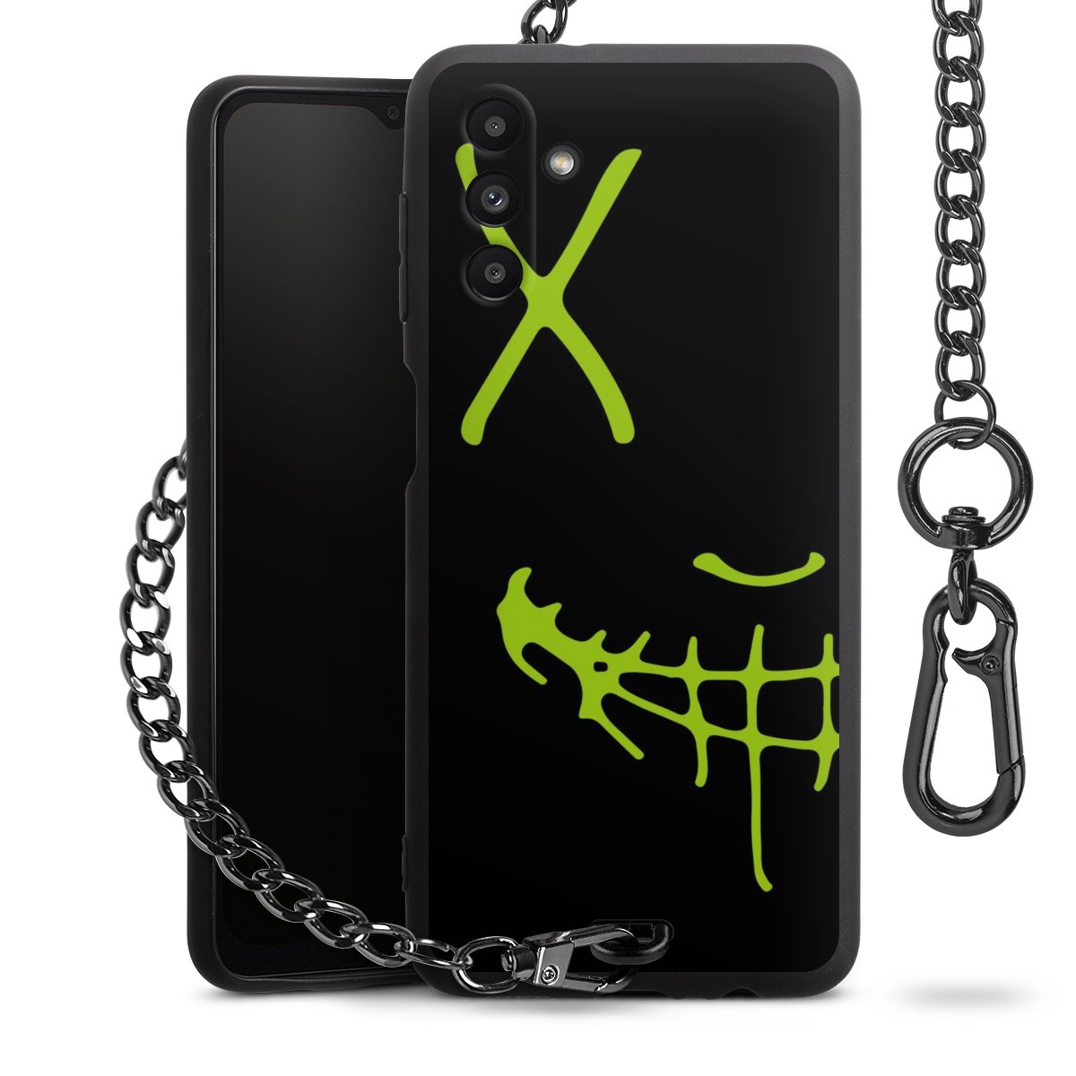 Die mattschwarze Silikon-Handyhülle besteht aus robustem TPU (thermoplastisches Polyurethan). Sie ist flexibel und schützt Dein Smartphone vor Stößen und Kratzern. Die Kette sowie der Karabinerhaken sind aus Metall in Gunmetal-Optik gefertigt. Für dieses Produkt kommen ausschließlich TÜV-geprüfte Materialien zum Einsatz.