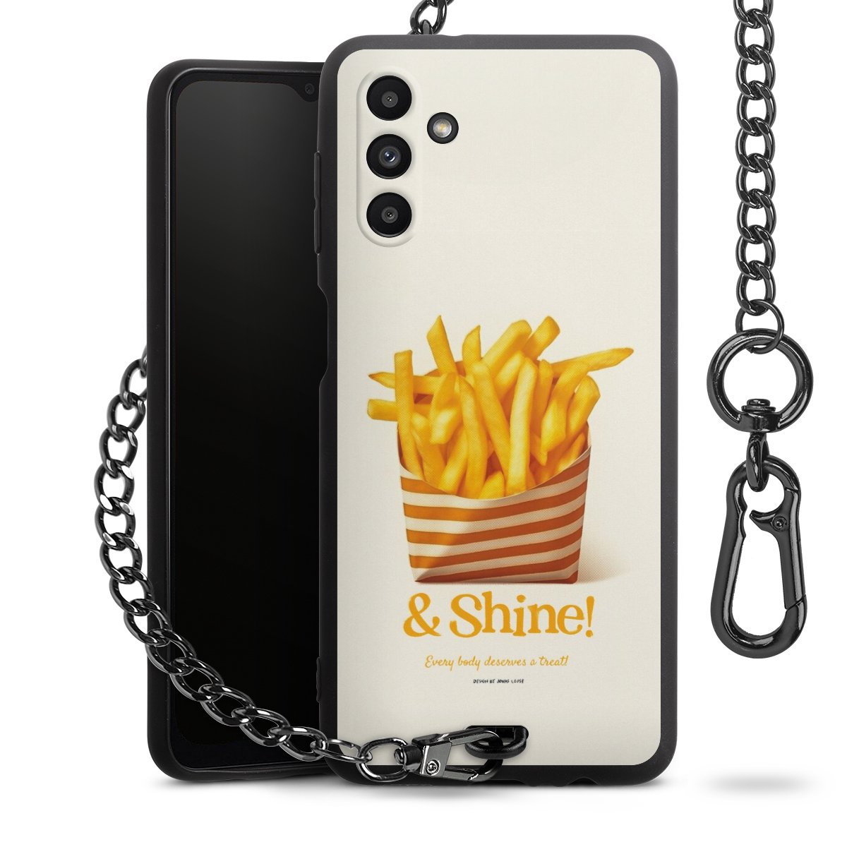 Die Handyhülle verfügt über eine mittig am unteren Rand platzierte Öse, an der die Metallkette stabil befestigt ist. Bestelle die Hülle einfach für Dein Smartphone-Modell, dann passt sie wie angegossen und Du brauchst sie bloß einmal anzudrücken. Handy in die Tasche, Karabiner an den Hosenbund – schon kann die Party starten.
