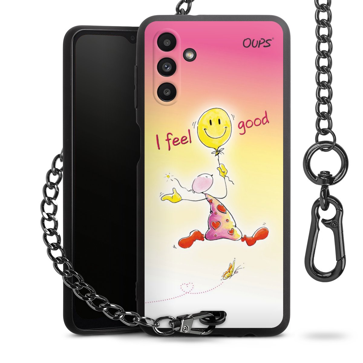 Die Handyhülle verfügt über eine mittig am unteren Rand platzierte Öse, an der die Metallkette stabil befestigt ist. Bestelle die Hülle einfach für Dein Smartphone-Modell, dann passt sie wie angegossen und Du brauchst sie bloß einmal anzudrücken. Handy in die Tasche, Karabiner an den Hosenbund – schon kann die Party starten.