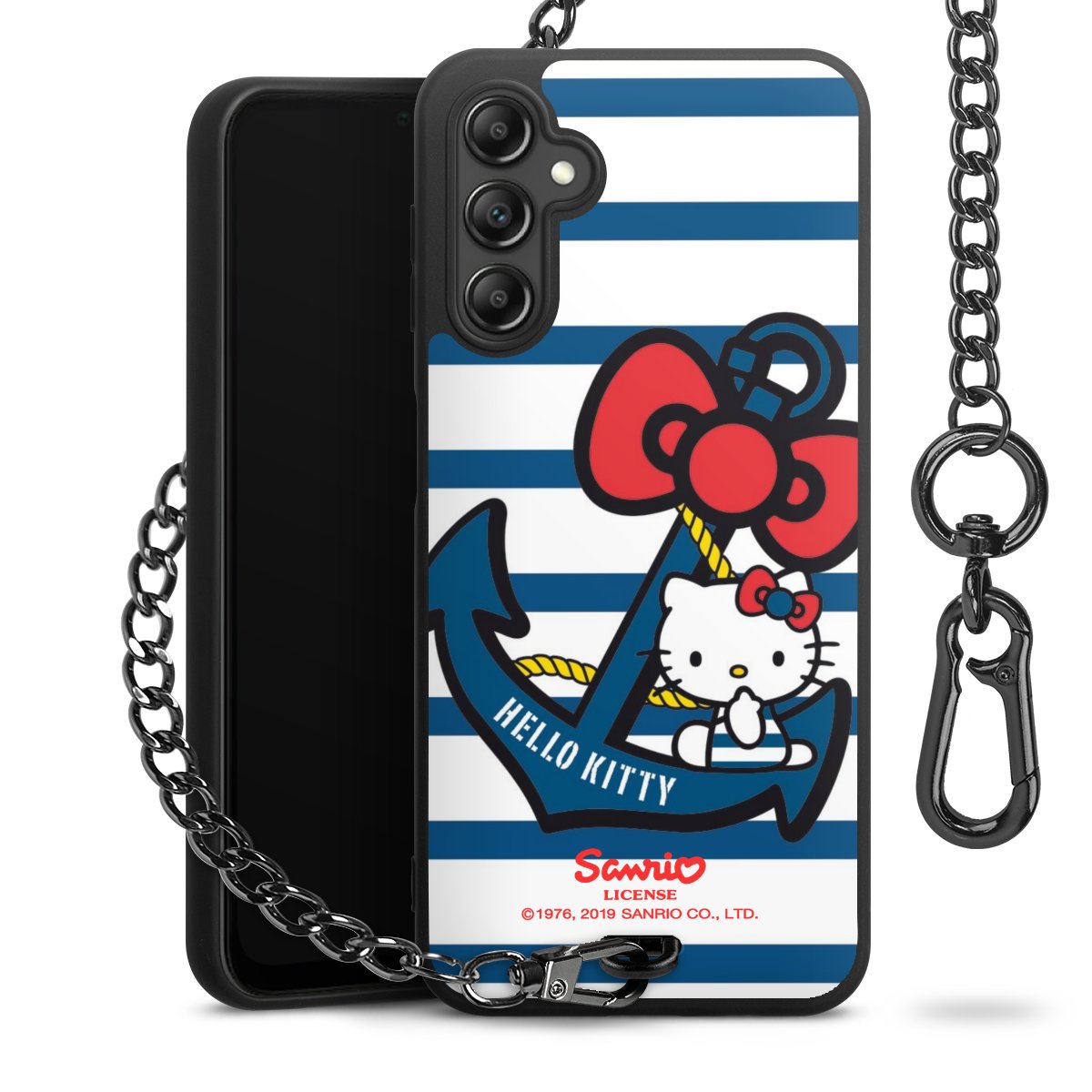 Die Handyhülle verfügt über eine mittig am unteren Rand platzierte Öse, an der die Metallkette stabil befestigt ist. Bestelle die Hülle einfach für Dein Smartphone-Modell, dann passt sie wie angegossen und Du brauchst sie bloß einmal anzudrücken. Handy in die Tasche, Karabiner an den Hosenbund – schon kann die Party starten.
