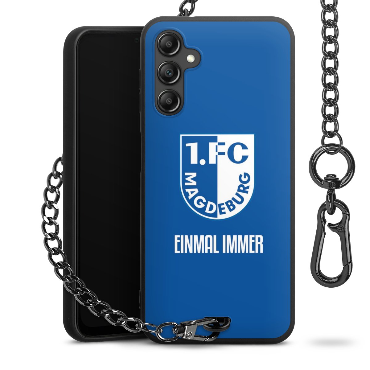 Die Handyhülle verfügt über eine mittig am unteren Rand platzierte Öse, an der die Metallkette stabil befestigt ist. Bestelle die Hülle einfach für Dein Smartphone-Modell, dann passt sie wie angegossen und Du brauchst sie bloß einmal anzudrücken. Handy in die Tasche, Karabiner an den Hosenbund – schon kann die Party starten.