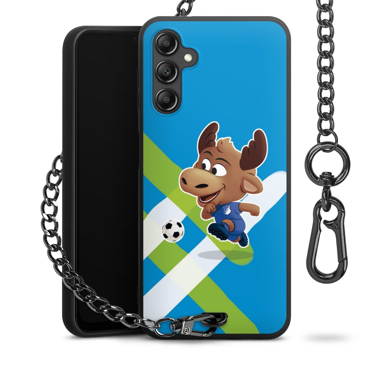 Die Handyhülle verfügt über eine mittig am unteren Rand platzierte Öse, an der die Metallkette stabil befestigt ist. Bestelle die Hülle einfach für Dein Smartphone-Modell, dann passt sie wie angegossen und Du brauchst sie bloß einmal anzudrücken. Handy in die Tasche, Karabiner an den Hosenbund – schon kann die Party starten.