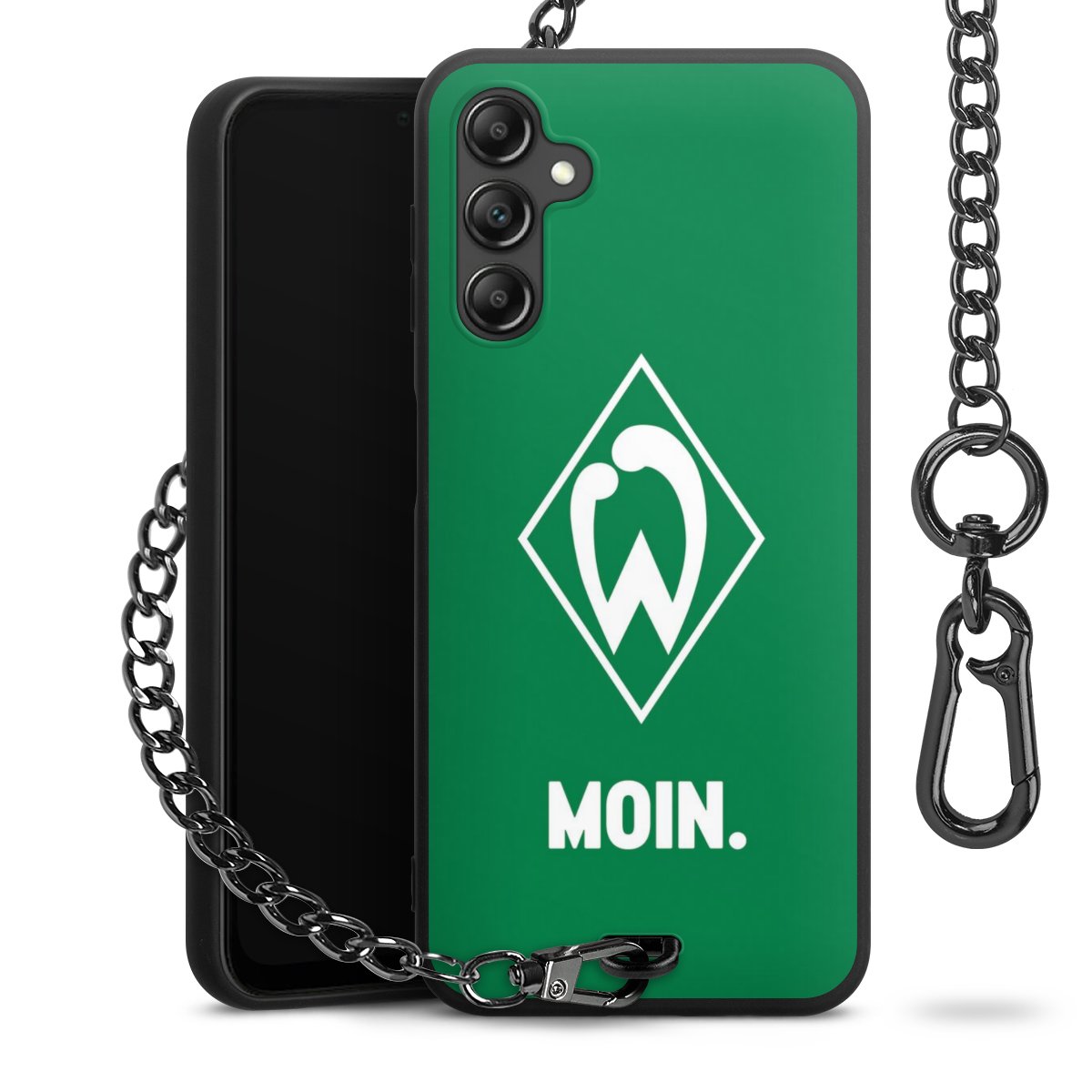 Die mattschwarze Silikon-Handyhülle besteht aus robustem TPU (thermoplastisches Polyurethan). Sie ist flexibel und schützt Dein Smartphone vor Stößen und Kratzern. Die Kette sowie der Karabinerhaken sind aus Metall in Gunmetal-Optik gefertigt. Für dieses Produkt kommen ausschließlich TÜV-geprüfte Materialien zum Einsatz.