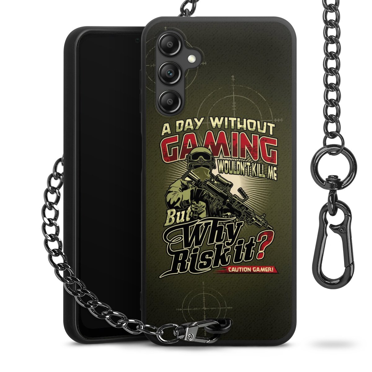 Die mattschwarze Silikon-Handyhülle besteht aus robustem TPU (thermoplastisches Polyurethan). Sie ist flexibel und schützt Dein Smartphone vor Stößen und Kratzern. Die Kette sowie der Karabinerhaken sind aus Metall in Gunmetal-Optik gefertigt. Für dieses Produkt kommen ausschließlich TÜV-geprüfte Materialien zum Einsatz.