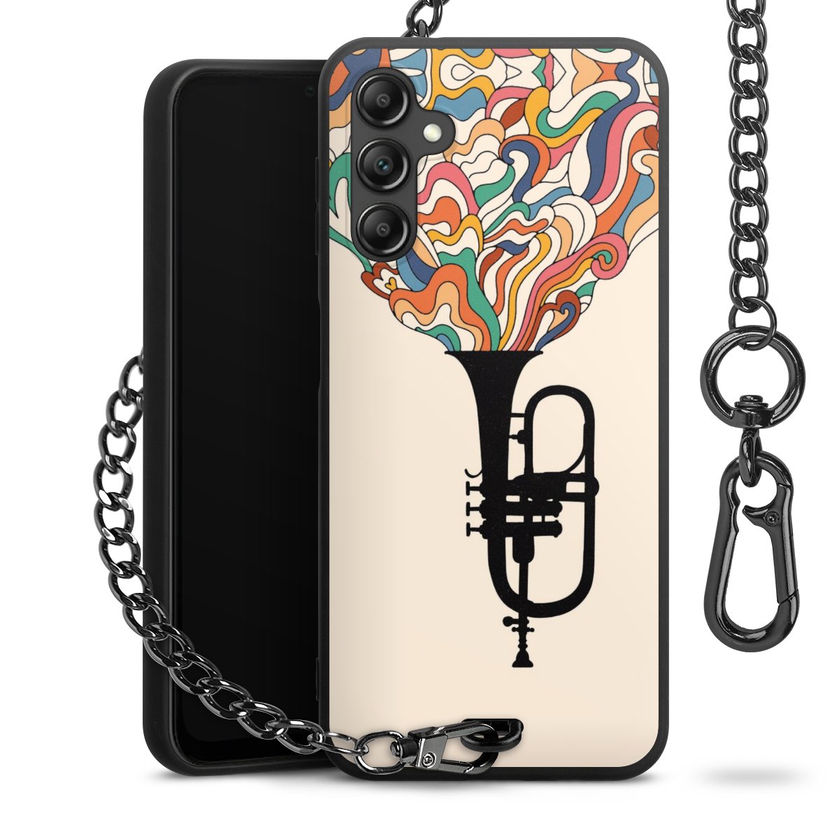 Die mattschwarze Silikon-Handyhülle besteht aus robustem TPU (thermoplastisches Polyurethan). Sie ist flexibel und schützt Dein Smartphone vor Stößen und Kratzern. Die Kette sowie der Karabinerhaken sind aus Metall in Gunmetal-Optik gefertigt. Für dieses Produkt kommen ausschließlich TÜV-geprüfte Materialien zum Einsatz.