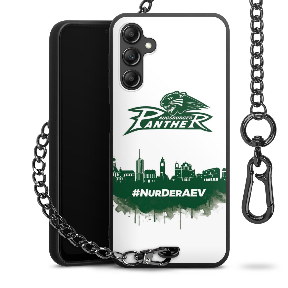 Die mattschwarze Silikon-Handyhülle besteht aus robustem TPU (thermoplastisches Polyurethan). Sie ist flexibel und schützt Dein Smartphone vor Stößen und Kratzern. Die Kette sowie der Karabinerhaken sind aus Metall in Gunmetal-Optik gefertigt. Für dieses Produkt kommen ausschließlich TÜV-geprüfte Materialien zum Einsatz.