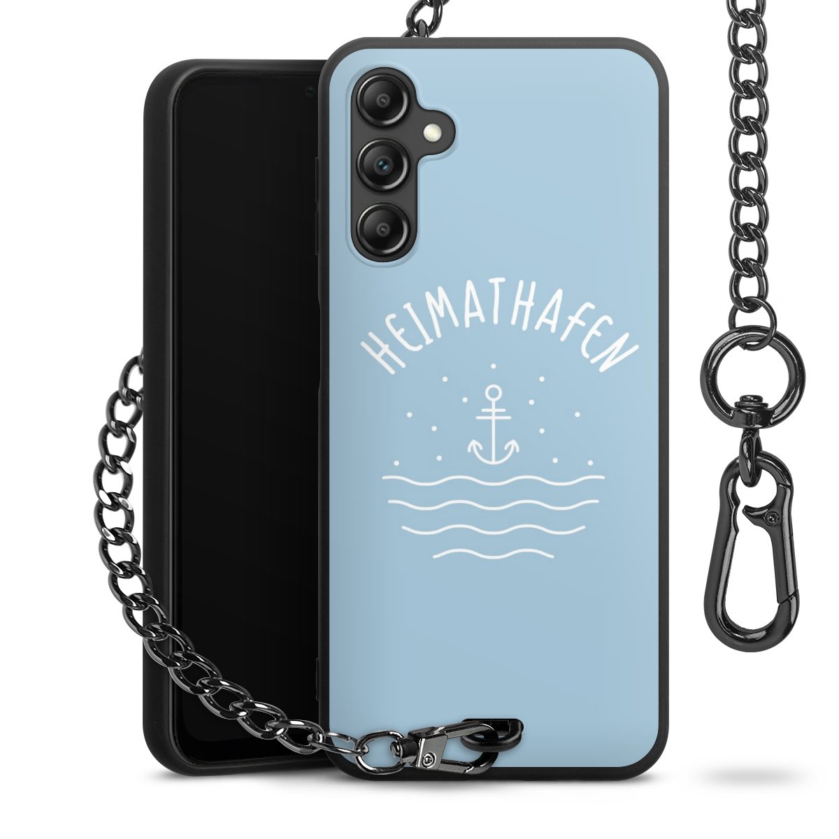 Die mattschwarze Silikon-Handyhülle besteht aus robustem TPU (thermoplastisches Polyurethan). Sie ist flexibel und schützt Dein Smartphone vor Stößen und Kratzern. Die Kette sowie der Karabinerhaken sind aus Metall in Gunmetal-Optik gefertigt. Für dieses Produkt kommen ausschließlich TÜV-geprüfte Materialien zum Einsatz.