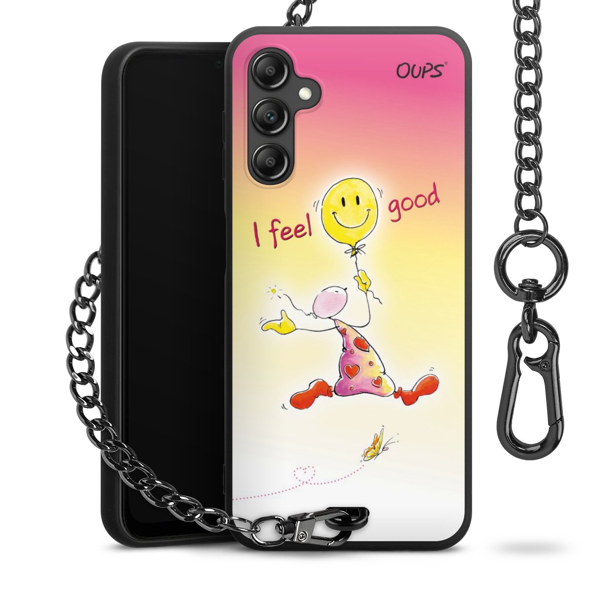 Die Handyhülle verfügt über eine mittig am unteren Rand platzierte Öse, an der die Metallkette stabil befestigt ist. Bestelle die Hülle einfach für Dein Smartphone-Modell, dann passt sie wie angegossen und Du brauchst sie bloß einmal anzudrücken. Handy in die Tasche, Karabiner an den Hosenbund – schon kann die Party starten.
