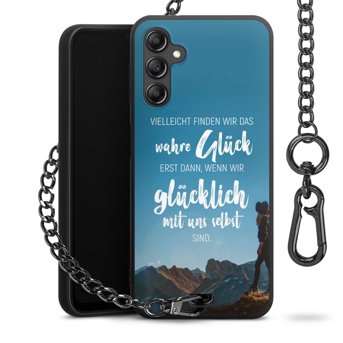 Die mattschwarze Silikon-Handyhülle besteht aus robustem TPU (thermoplastisches Polyurethan). Sie ist flexibel und schützt Dein Smartphone vor Stößen und Kratzern. Die Kette sowie der Karabinerhaken sind aus Metall in Gunmetal-Optik gefertigt. Für dieses Produkt kommen ausschließlich TÜV-geprüfte Materialien zum Einsatz.