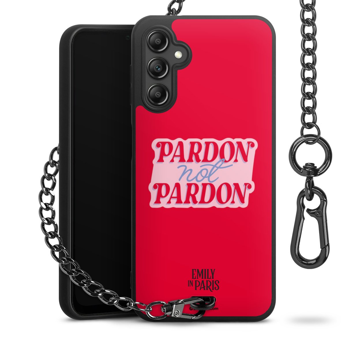 Die Handyhülle verfügt über eine mittig am unteren Rand platzierte Öse, an der die Metallkette stabil befestigt ist. Bestelle die Hülle einfach für Dein Smartphone-Modell, dann passt sie wie angegossen und Du brauchst sie bloß einmal anzudrücken. Handy in die Tasche, Karabiner an den Hosenbund – schon kann die Party starten.
