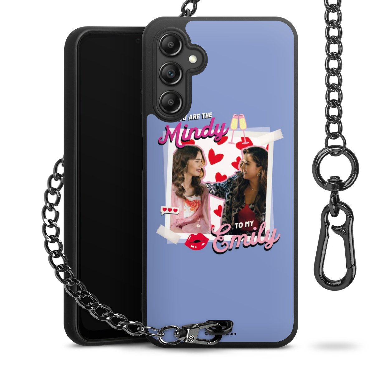 Die Handyhülle verfügt über eine mittig am unteren Rand platzierte Öse, an der die Metallkette stabil befestigt ist. Bestelle die Hülle einfach für Dein Smartphone-Modell, dann passt sie wie angegossen und Du brauchst sie bloß einmal anzudrücken. Handy in die Tasche, Karabiner an den Hosenbund – schon kann die Party starten.