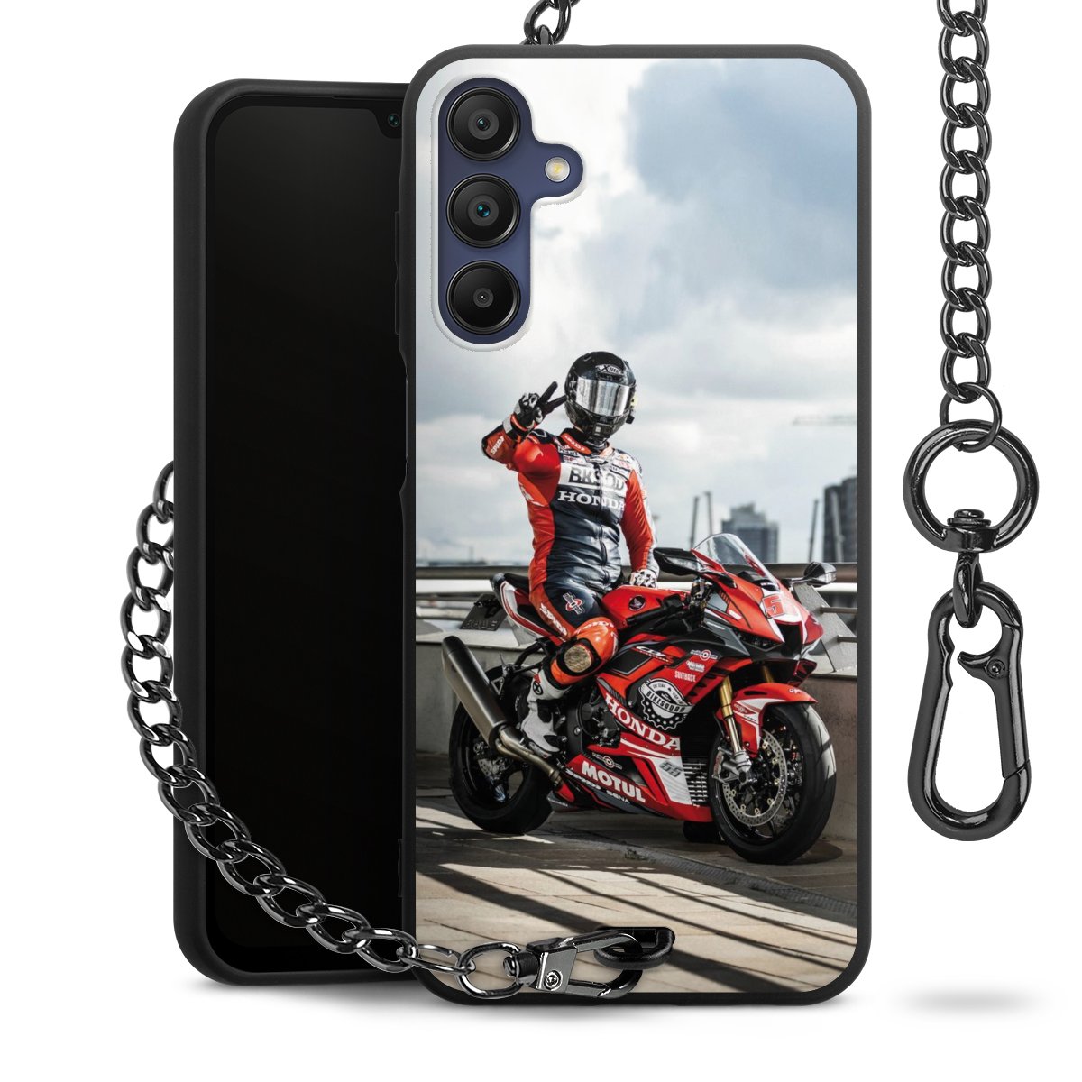 • Mattschwarze Handyhülle mit Metallkette